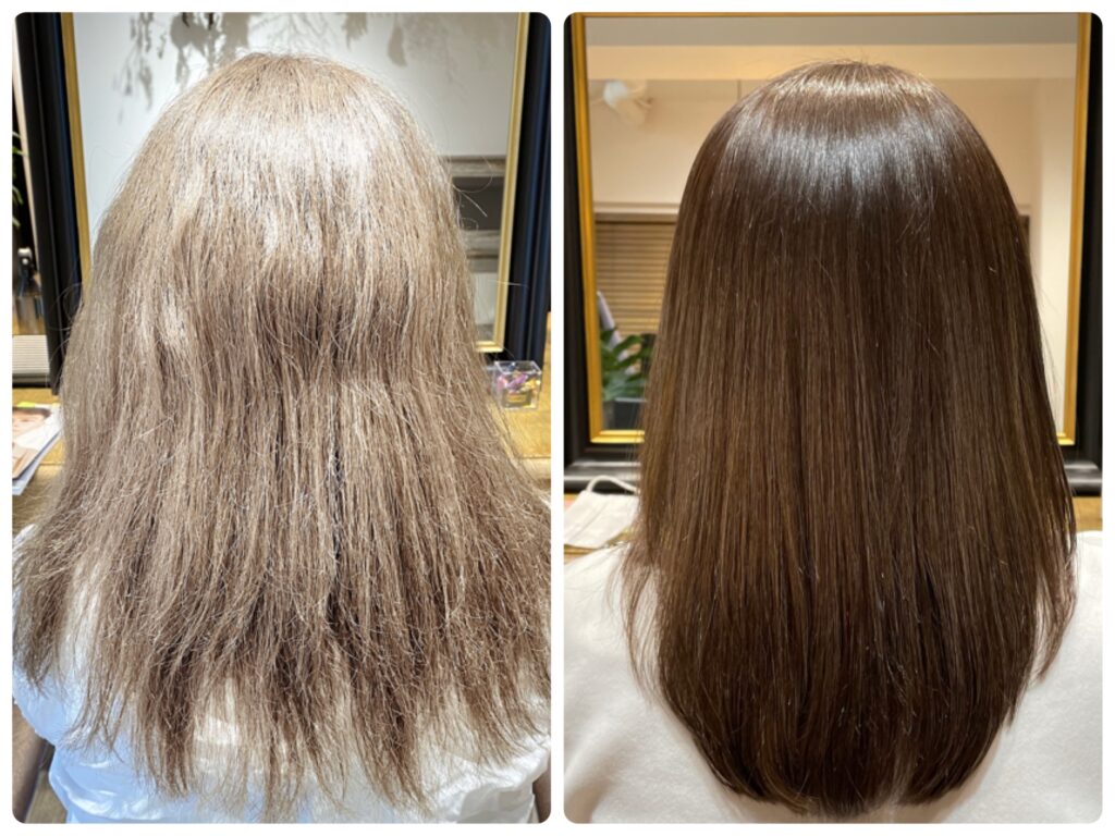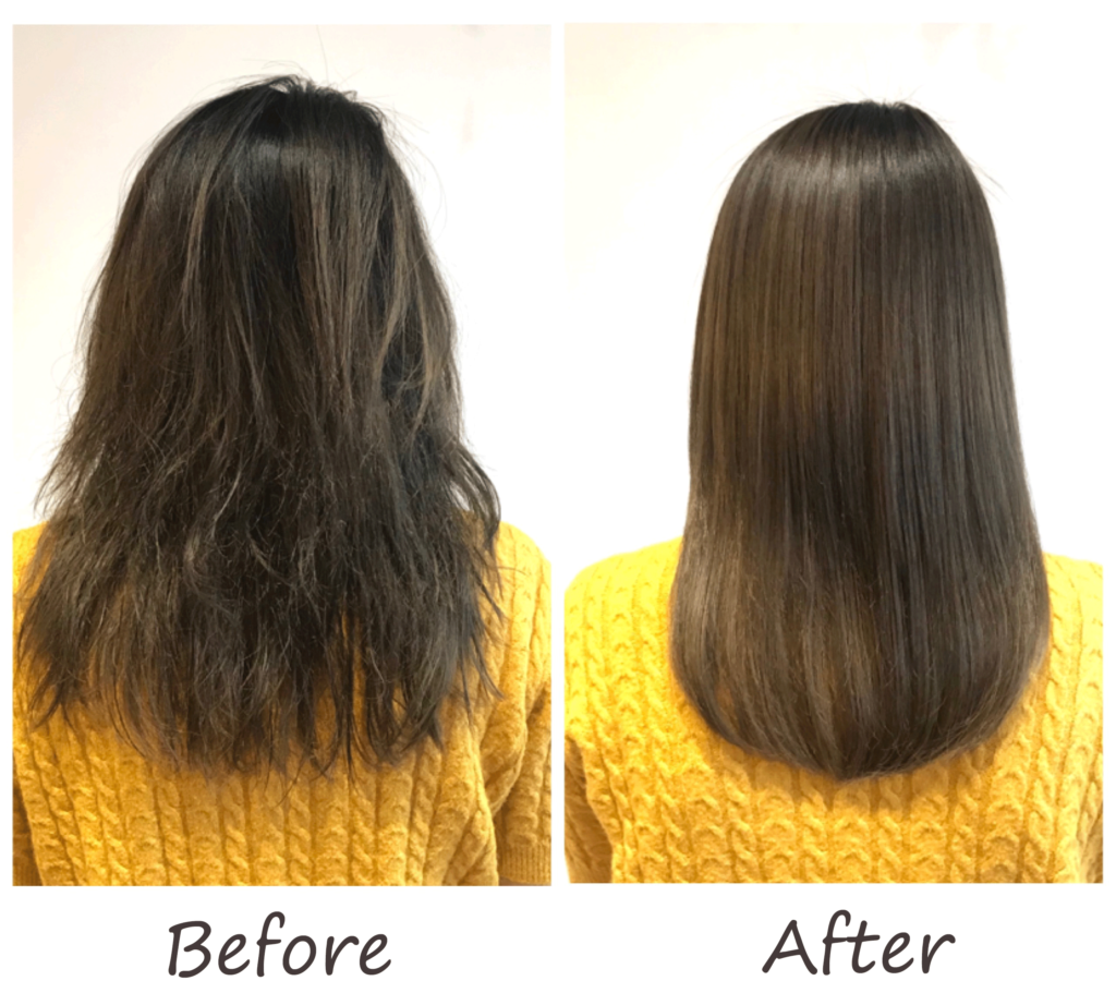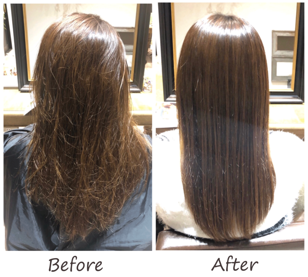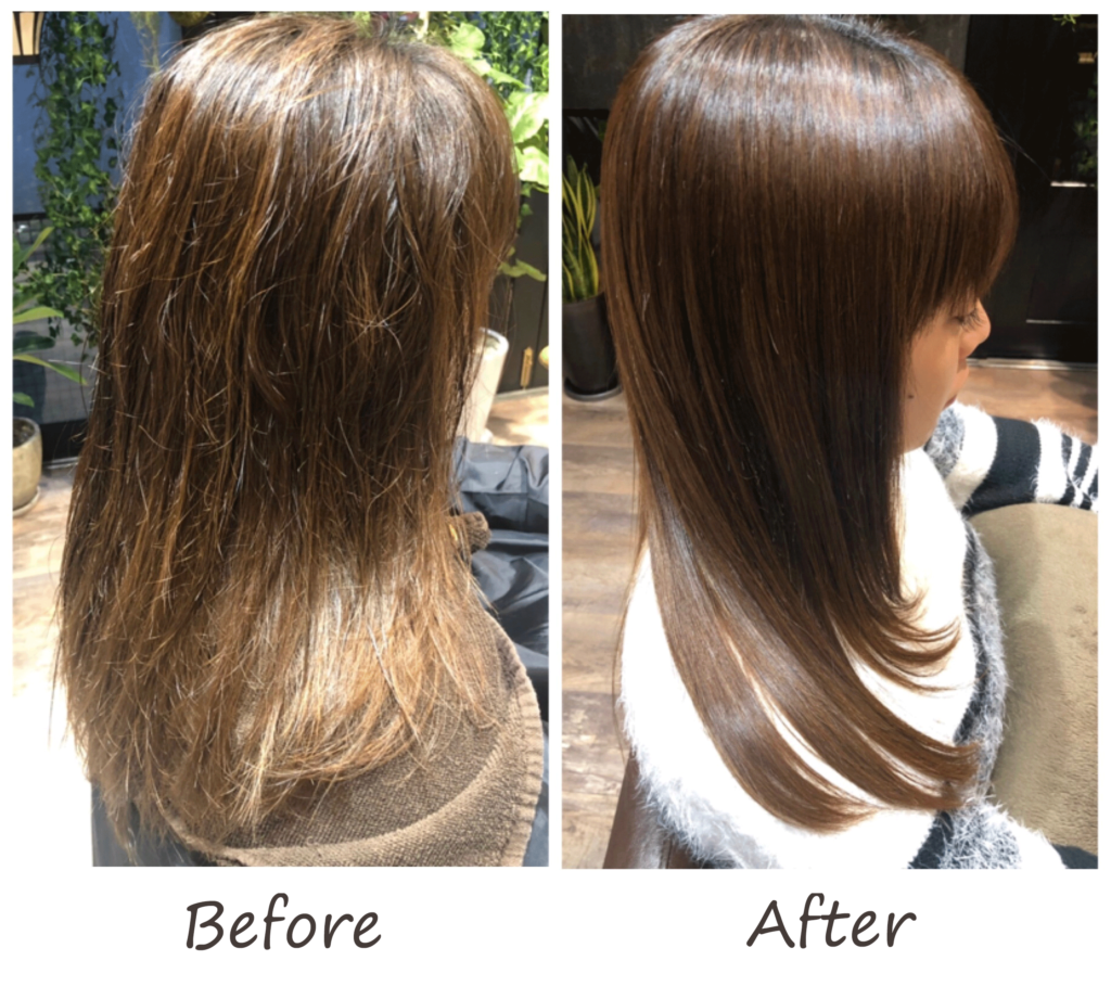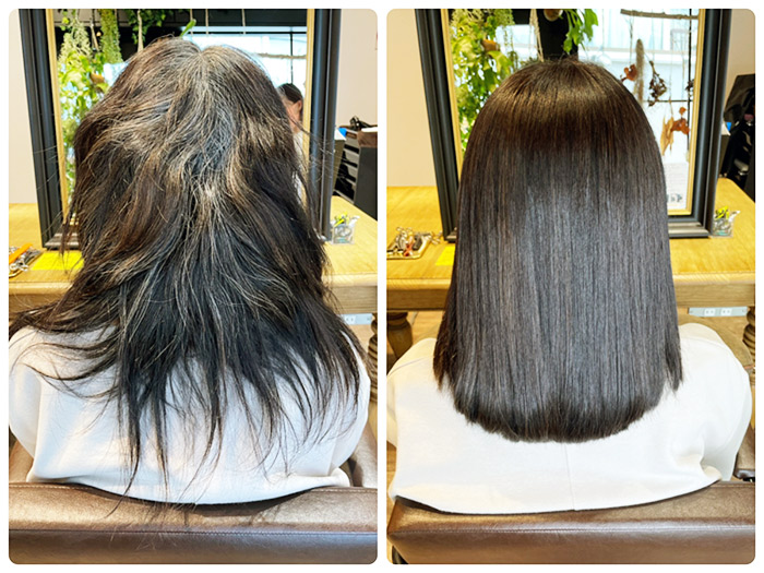 (初めて来店された方は、上記の写真のような美髪にはならないと半信半疑で来られているお客様もいらっしゃいますが、施術後は本当になった!と驚きの声をたくさんいただいております。
