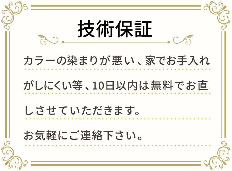 カラーの染まりが悪い。スタイリングしにくい。など、技術にご満足いただけなかった場合は無料でお直しさせていただきます。
