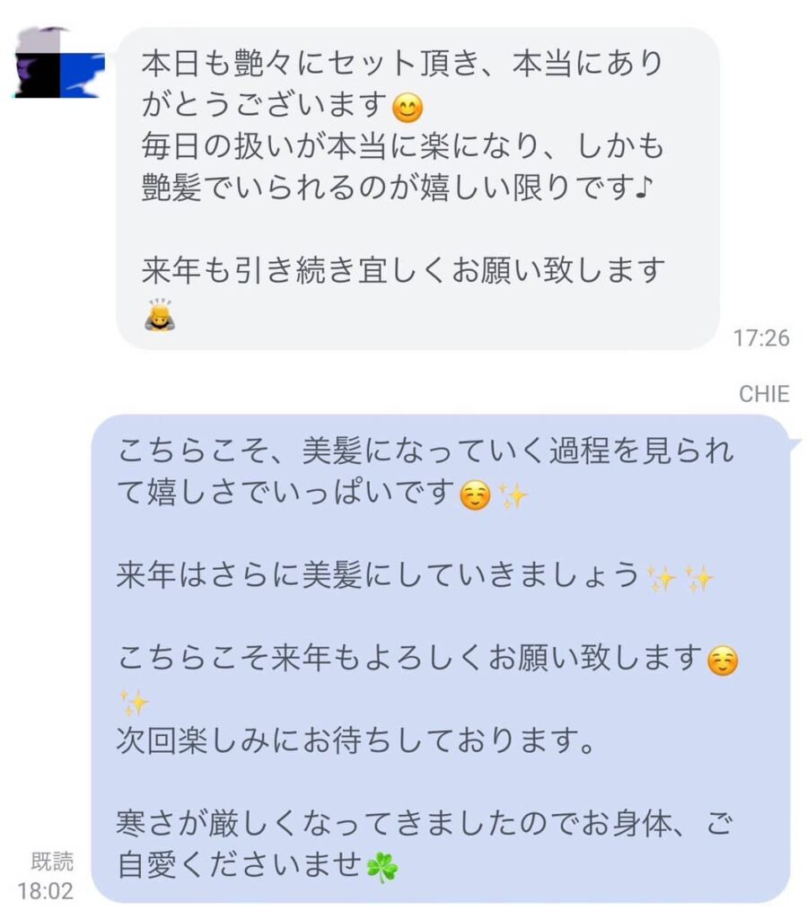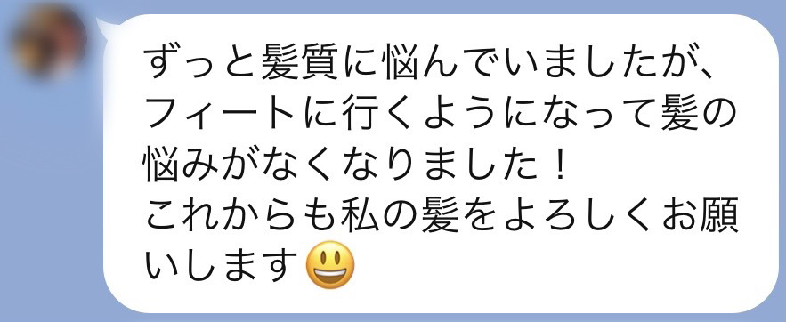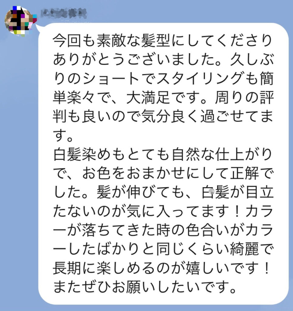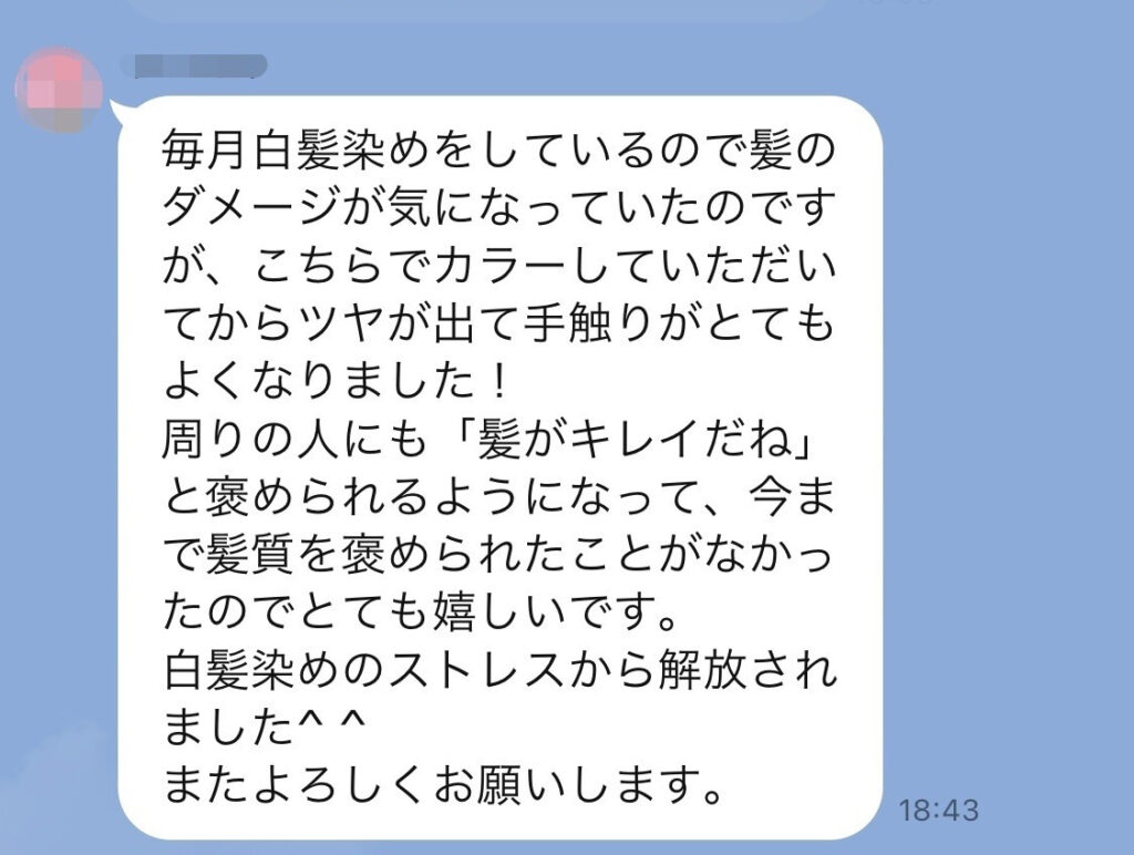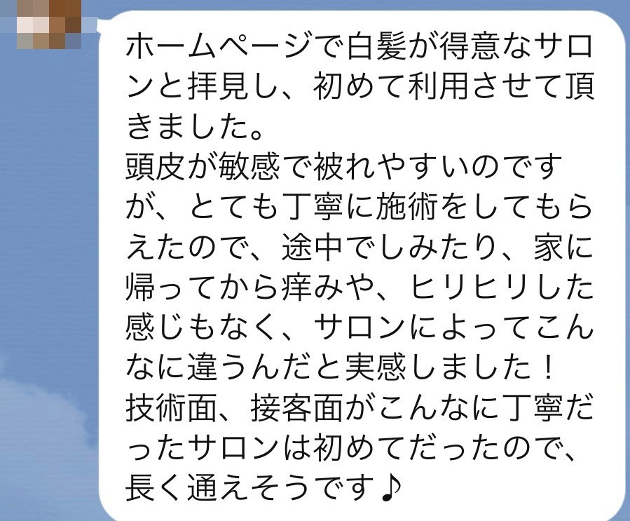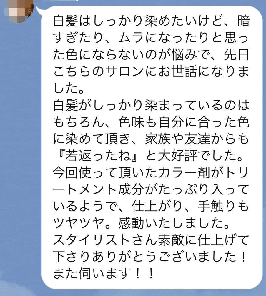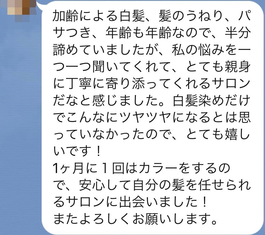 「FEAT.独自配合の白髪染めとFEAT.オリジナルの感動美髪トリートメント」をとても気に入られて毎月リピートされています。