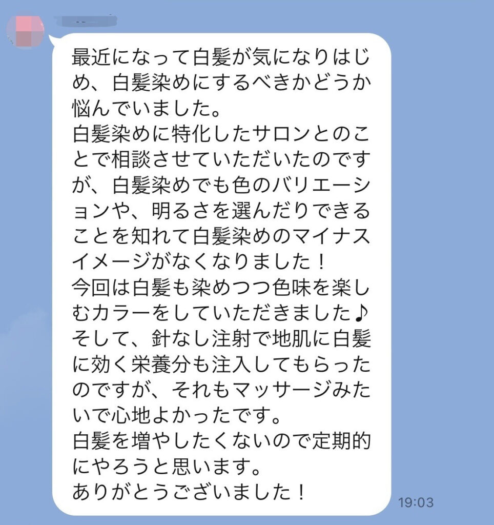 独自配合のノンジアミンの白髪染めを毎回オーダーされており、いつも感動していただいております。(施術する側の私たちも嬉しくなる瞬間です)
