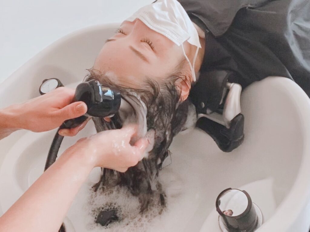 3,白髪抑制シャンプーと、炭酸泉で地肌と髪に残ったアルカリや汚れを浮き上がらせて素髪の状態に戻し
