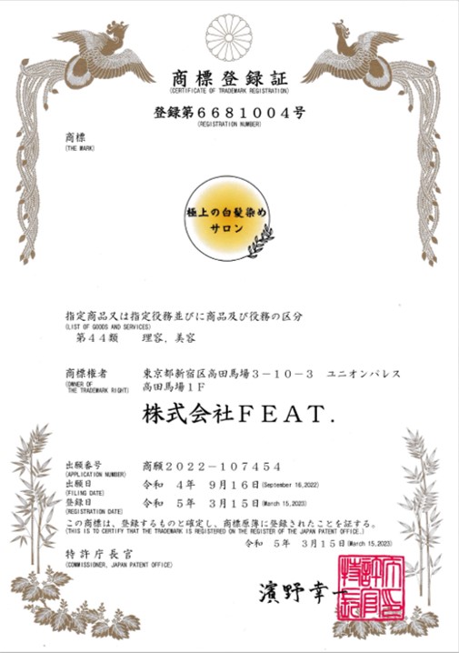 感動美髪サロンFEAT.は、特許庁から正式に商標を認定された日本で唯一の「感動美髪トリートメントサロン」です。